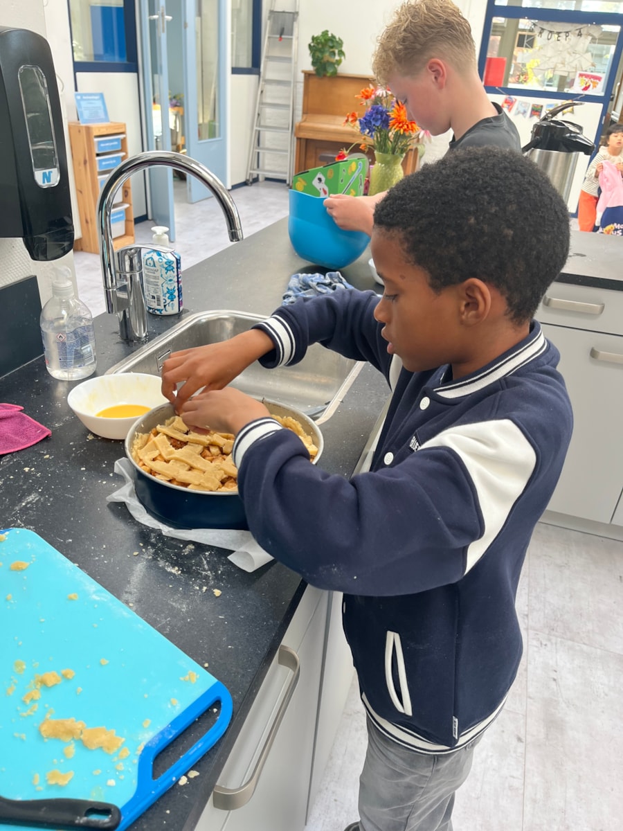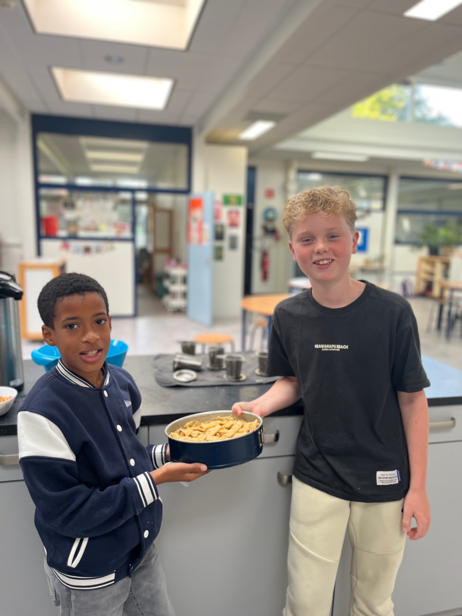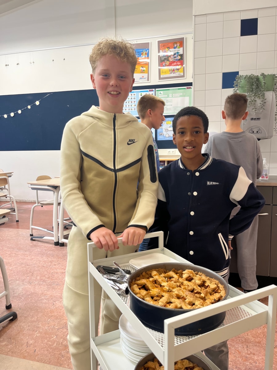 Vorige week mochten we in het Zuiderzeemuseum appels plukken. Vandaag hebben Tygo en Ray samen appeltaart gebakken voor de hele klas. We hebben er heerlijk van gesmuld met elkaar😍.